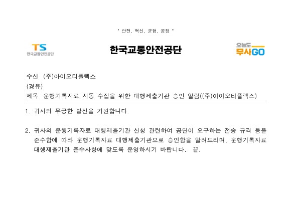 (주)아이오티플렉스는 그동안 환경부 올바로시스템(Allbaro) 전송 서비스를 통해 쌓아온 차별화된 데이터 관리 및 전송 기술력을 바탕으로, 최근 한국교통안전공단(TS) 으로부터 '운행기록자료(DTG) 자동 수집을 위한 대행제출기관' 으로 공식 승인을 받게 되었음을 안내드립니다.